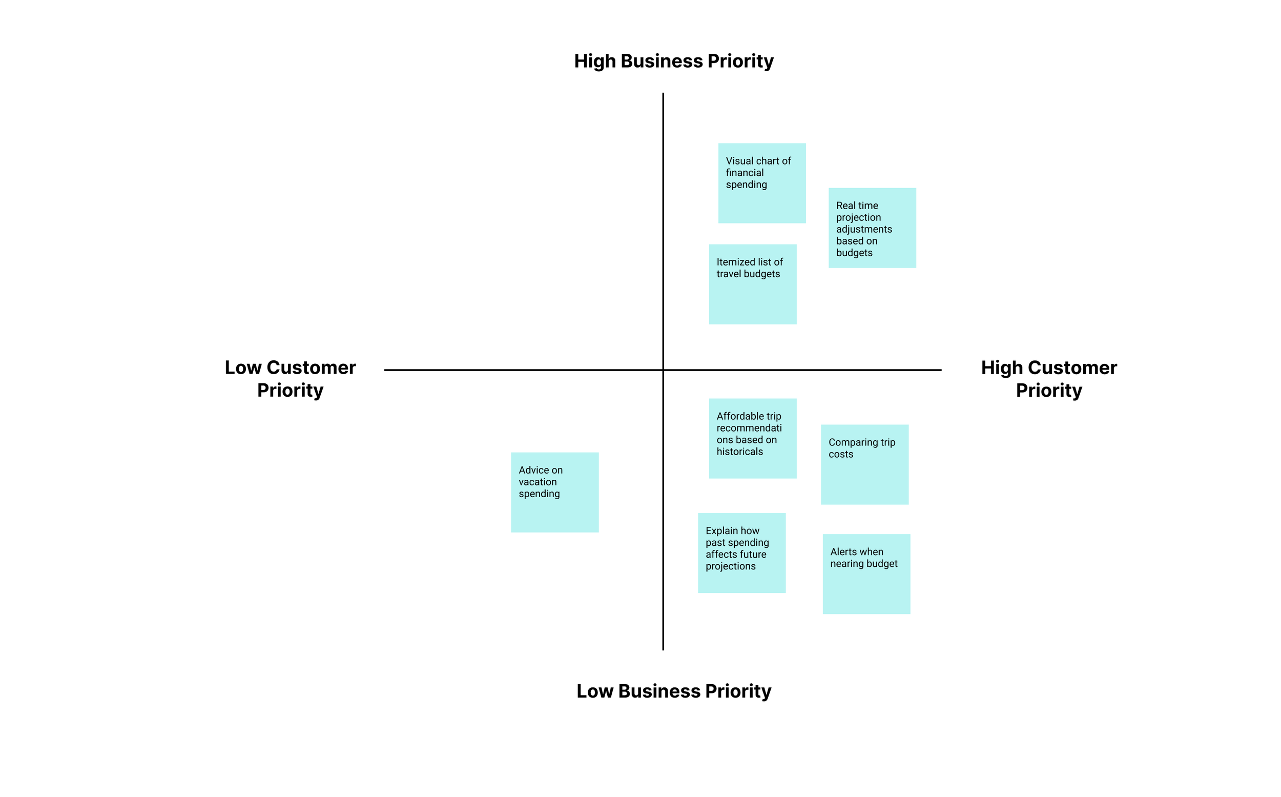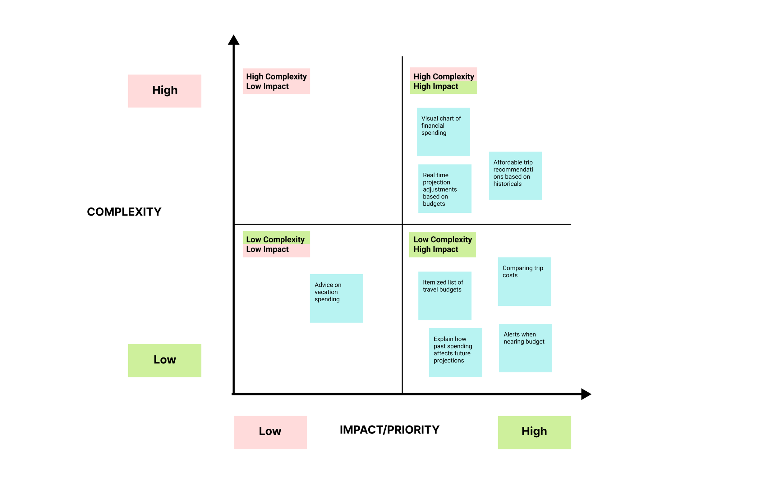 The features that made it to high impact and low complexity were: itemized budgets, alerts, comparing trip costs, and projections. This was our focus.