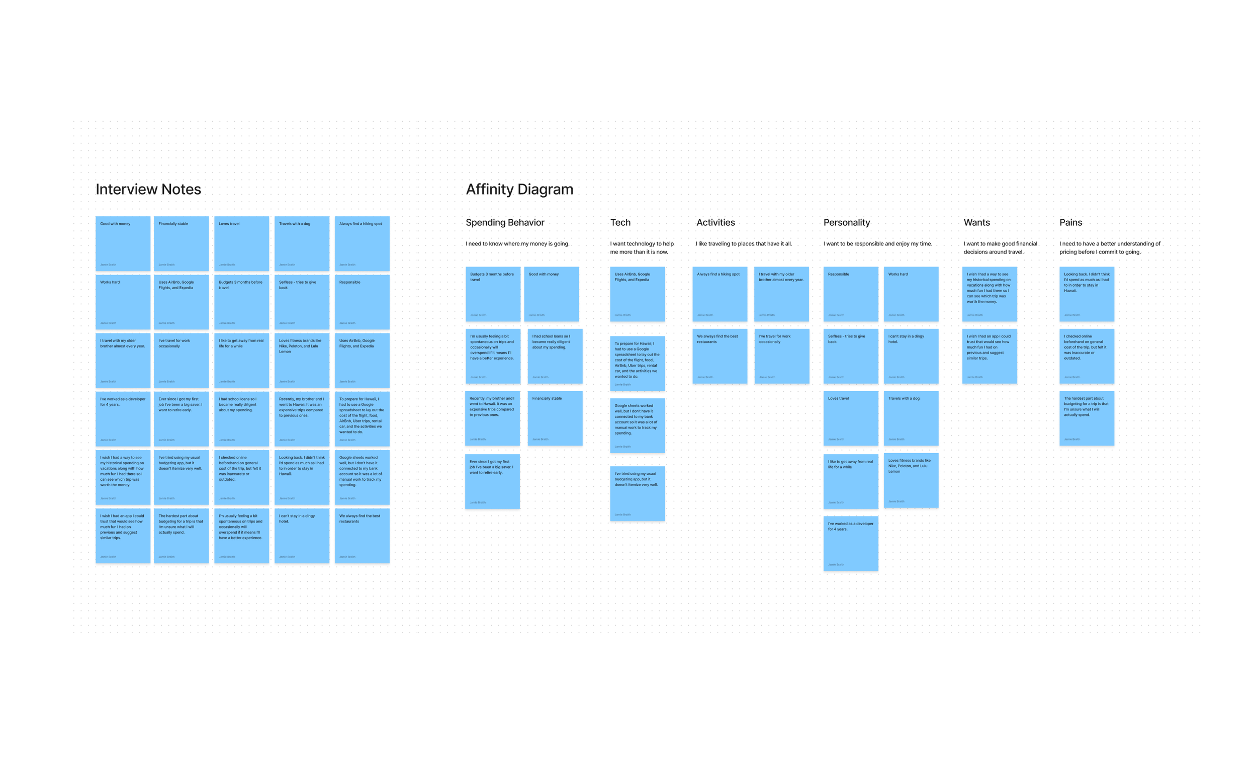 We gathered our raw data from interviews, added them to sticky notes, and grouped them by theme: spending behavior, tech, activities, personality, wants, and pains. We learned that people struggled to guess what they’d actually spend.