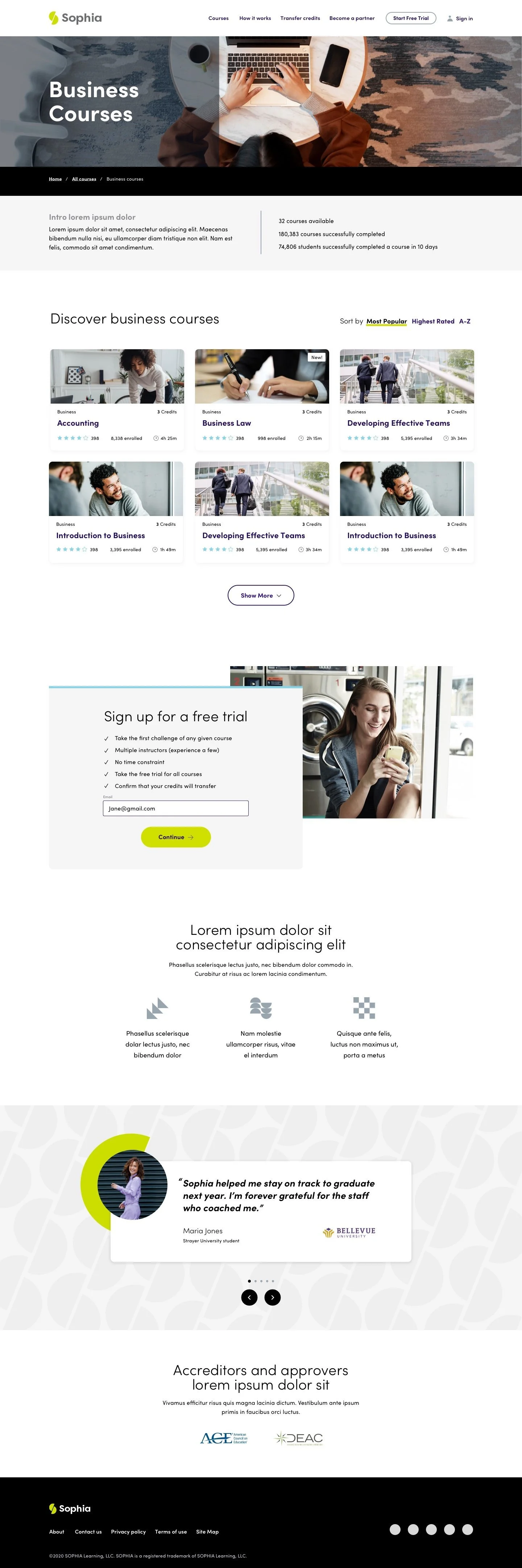 We wanted to chunk course categories to make them easier to find and navigate to. Here is an example of a course category page with a listing of all business courses.
